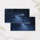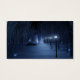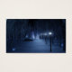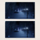 Un sendero cubierto de nieve que serpentea por el bosque de abedules en una noche de invierno oscura. El camino está bordeado de farolas que desprenden un resplandor azul plateado, pero en las sombras hay formas luminosas e hipnotizadoras como pequeñas luces de hadas que atraen al viajero fuera del camino. A la distancia, el brillo de lavanda de una misteriosa reunión forestal ilumina el frío cielo.