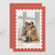Una tarjeta de Navidad de una foto presenta un marco de franqueo y tipografía moderna.