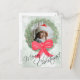 Esta hermosa postal acuática pintada a mano es una excelente manera de enviar saludos de vacaciones. Muestra tu foto dentro de una corona de ramas de pino y bayas con un gran arco rojo sobre un fondo verde de mármol. La leyenda dice: ¡Feliz Navidad! Hay espacio para un breve saludo y firma en la parte trasera.