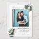 Hojas de palma de moda con una falsa invitación a la boda con foto de marco dorado.
