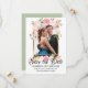 La tarjeta Save the Date es romántica y de moda y muestra la fotografía de tu pareja rodeada de un marco dorado moderno y elegante. rosas rosas Rubor rosas, rosas rosadas rosadas y rosas cremosos de albaricoque embellecen el marco. Guardar la fecha se escribe a continuación en un guión que sigue. Sus nombres están escritos con una letra moderna con la fecha y la ubicación a continuación. La invitación formal para seguir completa el texto. Todo el texto es editable. También puede cambiar el tamaño, el tipo de letra y el color. La parte posterior de la tarjeta Save the Date es un color verde sabio suave para complementar a los rosas. Mira de cerca y verás el indicio de un patrón floral.