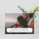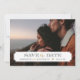 Diseño de tarjeta de anuncio de boda con foto moderna Chic para guardar la fecha. La plantilla cuenta con espacio para una de tus fotos de compromiso con un marco clásico simple superpuesto donde puedes agregar la fecha de la boda y los nombres de la novia y el novio. Hay espacio en el reverso para agregar texto adicional si es necesario. Utiliza las herramientas de diseño para personalizar las fuentes, mover el texto, cambiar los tipos de papel y el color de fondo para crear un diseño de anuncio único y personalizado.