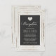 Esta elegante tarjeta de detalles de recepción de boda vintage presenta una imagen impresa de un marco de madera rústica blanqueada con una inserción de aspecto de pizarra. El estilo tipográfico de las letras añade elegancia y romanticismo. Perfecto para una boda con temática vintage, rústica o campestre.