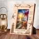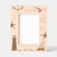 Marco de imagen cubierto con un diseño náutico con velero, gaviota, faro y pez estrella. Hermoso para una casa de playa. Por ejemplo, puede agregar una foto del personalizado o información de alquiler.