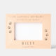 Elegante fotograma de madera grabada con láser para honrar la memoria de tu perro con huellas de pata, las inscripciones "En memoria amorosa" y "Para siempre en nuestros corazones" en la tipografía clásica de los serif, y su nombre y su sentimiento personal.