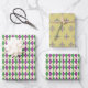 Los brillantes diamantes de color violeta y verde, recubiertos de diamantes de color dorado, y el flur de lis recuerdan la juerga y las celebraciones asociadas con el mardi gras de Nueva Orleans, mientras que una base crema aporta un toque de refinamiento a este patrón de argyle. Dos hojas de este conjunto presentan el patrón de argyle solo, mientras que la tercera hoja presenta un patrón de fleur de lis decorado con el patrón de argyle sobre un fondo dorado desvanecido para darle opciones y variedad para su envoltura de regalo o proyectos DIY.