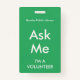 Marcas verdes de mar brillante "Pregúntame" para voluntarios, profesores, docentes, guías, organizadores de eventos para eventos especiales, como bodas, ferias de artesanías, espectáculos caseros y de jardín, eventos caritativos, negocios y funciones corporativas. El color de la tipografía es marfil pálido, lo que le da a esta insignia un aspecto moderno.