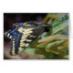 Fotografía original de una mariposa de cola tortuosa de anís, descansando en una planta de yampa. Vista lateral más cercana de la mariposa, mostrando las hermosas alas de rayas amarillas y negras, con brillantes luces azules y naranjas. También mostrando la cabeza de la mariposa, sus ojos, antenas y proboscis.