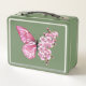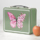 Arreglo floral de mariposa rosa con flores japonesas de cerezo rosadas sobre fondo blanco.