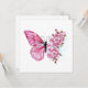 Arreglo floral de mariposa rosa con flores japonesas de cerezo rosadas sobre fondo blanco.