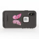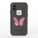 Arreglo floral de mariposa rosa con flores japonesas de cerezo rosadas sobre fondo blanco.