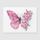 Arreglo floral de mariposa rosa con flores japonesas de cerezo rosadas sobre fondo blanco.