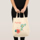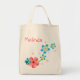 Mariposa en Flor © Sunny Mars Designs. Esta dulce y bonita bolsa de compras orgánica de comestibles incluye un gráfico ilustracion vectorial de personalizado floral de una mariposa abstracta sentada en un hibisco rosa flor tropical con otra margarita azul y amarilla como flores arriba. Personalízalo agregándole tu propio nombre u otro texto.