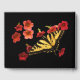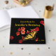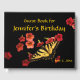 Personaliza o elimina fácilmente el texto de este encantador libro de invitados para fiestas de cumpleaños que incluye una mariposa cola de cigalas amarilla y negra sobre flores calibrachoa rojas y rosas.