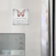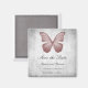Elegante y simple imán Save The Date con una mariposa rosa sobre un fondo gris. Este diseño es una elección única para anunciar un boda moderno. Fácil de personalizar con los detalles de su boda. Haga clic en "Personalizar" para encontrar más opciones de personalización.