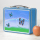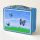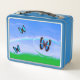 Esta caja de almuerzo se muestra con una impresión de mariposas. El color de la caja de almuerzo es el Personalizar Azul claro este artículo o compra tal como está. Imagen de stock