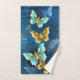Composición de vuelo, joyería, oro y mariposas oscuras sobre fondo de joyería texturada. Mariposa dorada.