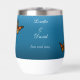 Mariposas monarcas elegantes en naranja contra un fondo oscuro azul, creando un diseño romántico e inspirado en la naturaleza. Ideal para los bodas al aire libre, al aire libre o con motivos de mariposa.