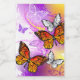Naranja, mariposas monarcas detalladas sobre la luz, púrpura, pintoresco fondo pintado.