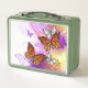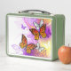 Naranja, mariposas monarcas detalladas sobre la luz, púrpura, pintoresco fondo pintado.