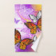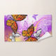 Naranja, mariposas monarcas detalladas sobre la luz, púrpura, pintoresco fondo pintado.
