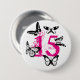 Un botón para los 15 años con un número rosado "15" y mariposas negras para su cumpleaños.