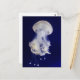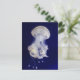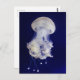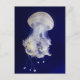 Esta postal muestra una foto de una medusa blanca contra un fondo azul.
