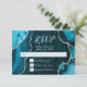 Completa la papelería de tu evento con esta elegante tarjeta de RSVP que presenta un diseño de mármol de ágata azul teal acentuado con detalles de plata lujosos. El fondo inspirado en geodas audaces crea una apariencia dramática y sofisticada, perfecta para bodas, cumpleaños, celebraciones formales o eventos nocturnos glamorosos. Diseñada con secciones de respuesta claras, esta tarjeta de RSVP permite a los invitados confirmar fácilmente su asistencia, indicar el número de asistentes y responder con aceptación o lamentaciones. La tipografía limpia y moderna mantiene los detalles fáciles de leer mientras complementa la rica textura de ágata. Personaliza fácilmente todo el texto para adaptarlo a tu evento y coordina hermosamente con la papelería correspondiente.