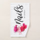 Toalla de uñas moderna con botellas de esmalte en tonos rosas, escritura tipográfica "Nails" en letra manuscrita negra. Personalice con un nombre en la parte delantera, título Perfecto para su negocio de uñas.
