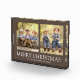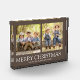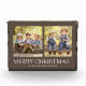 Bloque de fotos acrílicas con 2 de tus fotos favoritas sobre un fondo marrón personalizable. El texto dice: "Feliz Navidad", pero haz que diga lo que quieras. Personalizado con nombres o con su propio texto adicional.