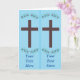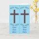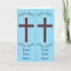 Un cuadro de una cruz de madera marrón está rodeado por un conjunto de flores moradas con hojas verdes. El fondo es azul cielo claro. El diseño se imprime dos veces, lado a lado, haciendo que tu tarjeta de felicitación también sirva como marcador. Hay un marcador de posición de plantilla para que escriba su propio mensaje en cada marcador. El diseño de temática cristiana es de CherylsArt.