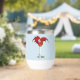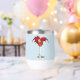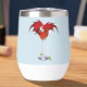 Un tierno dragón rojo se está sumergiendo en una aceituna verde en un vaso de martini
