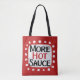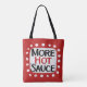 "Más Salsa Caliente" es un lindo diseño de texto en rojo con texto en negro y rojo, junto con una forma de acento blanco y puntos caprichosos de textura blanca que lo rodean.