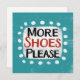 "Más zapatos por favor" es un divertido diseño de texto con una forma de acento blanco rodeado de puntos de textura caprichosos.