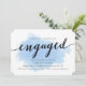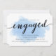 Esta invitación a la fiesta de compromiso de niebla azul muestra la palabra "comprometido" en un guión moderno con un salpicón de color azul.