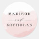 Sencillos y elegantes pegatinas de boda con un lavado de acuarela rosa y con marcadores de posición para personalizar con sus nombres. Los pegatinas de boda personalizados son perfectos para ser utilizados como sellos para sobres bodas o favores de fiesta.