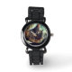 Un reloj de pulsera para niños con plantilla de foto para agregar una foto de un mascota. La banda de plata es una de las muchas opciones para chicas o niños. Se presenta un gato de rescate, que puede ser reemplazado fácilmente con su propia imagen de perro o gato.