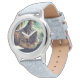 Un reloj de pulsera para niños con plantilla de foto para agregar una foto de un mascota. La banda de plata es una de las muchas opciones para chicas o niños. Se presenta un gato de rescate, que puede ser reemplazado fácilmente con su propia imagen de perro o gato.