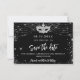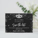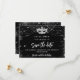 Una chica y de moda Guardar la tarjeta de fecha para un fiesta de máscaras de cumpleaños número 50 (o cualquier edad). Un fondo negro clásico decorado con finos destellos de plata y una máscara de máscaras. Personalice y agregue una fecha y un nombre/edad. El texto: Save the Date se escribe con un gran guión de estilo escrito a mano.