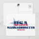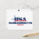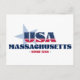 Postal de Massachusetts. Un diseño tipográfico creativo que encapsula la esencia de Massachusetts con colores rojo, blanco y azul audaces, y elementos patrióticos, incluyendo estrellas y rayas.