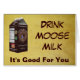 Cartón de leche de la mundialmente famosa y mítica granja lechera Matanuska Moose Milk en Willow Alaska; no muy lejos de Anchorage. También aparece el lema "Beba leche de alce, es bueno para ti". La imagen del logo muestra a una sirvienta ordeñando a mano a Matilda, la primera alce lechera de la granja. Créanlo o no, hay moras de alce; un pequeño número en Rusia y uno en Suecia. La leche de alce se cultiva comercialmente en Rusia. Un ternero de alce nacido en una granja es tomado de su madre en las 2-3 horas siguientes al nacimiento y es criado por la gente. Primero se alimenta con una botella de un sustituto de la leche y después se alimenta de un cubo. Los animales se imprimen y se unen a los humanos. La leche es alta en materia de grasa butírica (10%) y sólidos (21,5%), según datos recogidos en alce ruso; la investigación sobre la leche de alce estadounidense está en un estado menos avanzado que en Rusia, pero parece indicar que el alce estadounidense tiene concentraciones aún mayores de sólidos en su leche. Se dice que la leche de alce es un poco salada y amarga; con un toque de pino o agujas picantes. La leche de alce se cultiva comercialmente en Rusia. Un ternero de alce nacido en una granja es tomado de su madre en las 2-3 horas siguientes al nacimiento y es criado por la gente. Primero se alimenta con una botella de un sustituto de la leche y después se alimenta de un cubo. Los animales se imprimen y se unen a los humanos. Al igual que con el ganado lechero, los terneros son retirados de sus madres después de un corto tiempo. Los rusos dicen que Moose pronto reconoce a las sirvientas como su sustituto como sus terneros sustitutos. En este punto son liberados al bosque; pero visitan la granja todos los días para ser ordeñados durante el periodo de lactancia (normalmente, hasta septiembre u octubre). Durante el invierno, los animales deambulan libremente por el bosque circundante. Pero por lo general no se alejan demasiado, sino que pasan gran parte de su tiempo en los bosques cercanos donde se talan árboles, alimentándose de los subproductos de las operaciones madereras. Y conocen la granja como el lugar para raciones diarias de avena, y como un lugar seguro para dar a luz a sus hijos pequeños. Un sanatorio ruso sirve leche de alce a los residentes en la creencia de que les ayuda a recuperarse de la enfermedad o a manejar las enfermedades crónicas de manera más efectiva. Algunos investigadores rusos han recomendado que se utilice leche de alce para la prevención de enfermedades gastroenterológicas en niños. Se cree que la granja Elk (Moose se llama Elk in Europe) House (Älgens Hus) en Bjurholm, Suecia es el único productor mundial de queso de alce. El queso se vende por unos 500 dólares por libra. El restaurante del Algens Hus ofrece platos de queso de oso. Queso liso con pan o galletas, o mejor aún, mousse de alce congelado. Mejor servido con frambuesas.