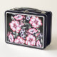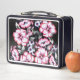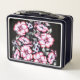 Este gráfico floral, se muestra en un patrón diamantífero, con grupos de flores, pétalos y hojas, en colores mudos; rosa, fuschia, lavanda, malva, verde y blanco - contra un fondo de negro.