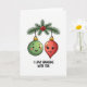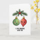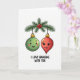 Abróchense las vacaciones de alguien con una alegre tarjeta de Navidades con dos adornos colgados en una rama de árbol de Navidad, completamente enamorados 🎄 El diseño es sencillo pero reconfortante, con un adorno ligeramente más grande que el otro, simbolizando una combinación perfecta. Los adornos son de un bonito color rojo y verde, destacando el fondo verde profundo del árbol. Esta tarjeta seguramente traerá una sonrisa a la cara de todos mientras imaginan la alegría y felicidad de la temporada navideña capturada en esta hermosa escena. Comparte el amor y la magia de los Navidades con esta tarjeta de saludo dulce y romántico.