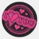 Este lindo pegatina de sellos de goma de "Te amo" de texto y corazones de color rosado caliente contra un fondo negro es perfecto para embellecer regalos El día de San Valentín, álbumes de fotos y más para un atractivo romántico.