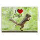 Una divertida foto de una ardilla linda haciendo una pose de yoga con el texto "I Heart Yoga" encima de él. La ardilla está en el pasamanos de madera de una cubierta exterior, en una posición de yoga con sus patas delante de él, una pierna detrás de él en el aire y la cola hacia afuera. A esta ardilla le gusta obviamente hacer sus ejercicios de yoga al aire libre, rodeado de naturaleza, con árboles en el fondo. Parece que está haciendo su versión del saludo del sol y tal vez a punto de entrar en la posición del perro hacia abajo. Se puede imprimir esta bonita imagen de ardilla en muchos productos diferentes que se pueden personalizar fácilmente. Si te gusta el yoga, y piensas que las ardillas son lindas, ¡esta es la foto para ti!