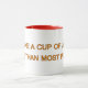 Me gusta más una taza de jugo que la mayoría de la gente (© Mira). Humor del café para un compañero de trabajo que puede tomar un chiste, o un buen amigo que acepta ser un poco antisocial. Si te gustó esta cita de café, probablemente ya te hayas dado cuenta de la ambigüedad que hay en ella. Se puede leer como "me gusta una taza de foie más que a la mayoría de la gente" o "me gusta más una taza de foie que a la mayoría de la gente". Una declaración para los "selectivamente sociales" a los que les gusta disfrutar de su taza de jugo mientras leen un buen libro o trabajan o juegan en la computadora.