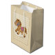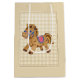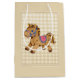 Bolsa de regalo para la ducha de bebé con gingham de bronceado y caballo de juguete.