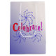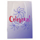 Las ruedas de las brillantes estrellas azules se parecen a los fuegos artificiales que rodean el texto "¡Celebrar!" en colores degradados de rojo a rosa (delineado en negro). La imagen se repite en el lado opuesto. El fondo es un sombreado azul oscuro a un blanco que cubre toda la bolsa.