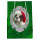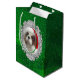 Esta es una bolsa de regalo mediana que presenta una fotografía original de un hermoso Blenheim Cavalier Rey Carlos espelín llevando su sombrero de Santa con fondo verde.