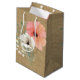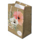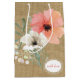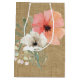Bonita bolsa de regalo de tamaño medio personalizado hecha con una apariencia de burrega. Flores pintadas de color agua decoran la parte delantera y trasera de la bolsa de regalo. Un área de texto ovalada decorativa blanca, en la parte inferior de la bolsa, tiene un texto personalizado de color coral que puede personalizar. Se dispone de papel tisular concordante.